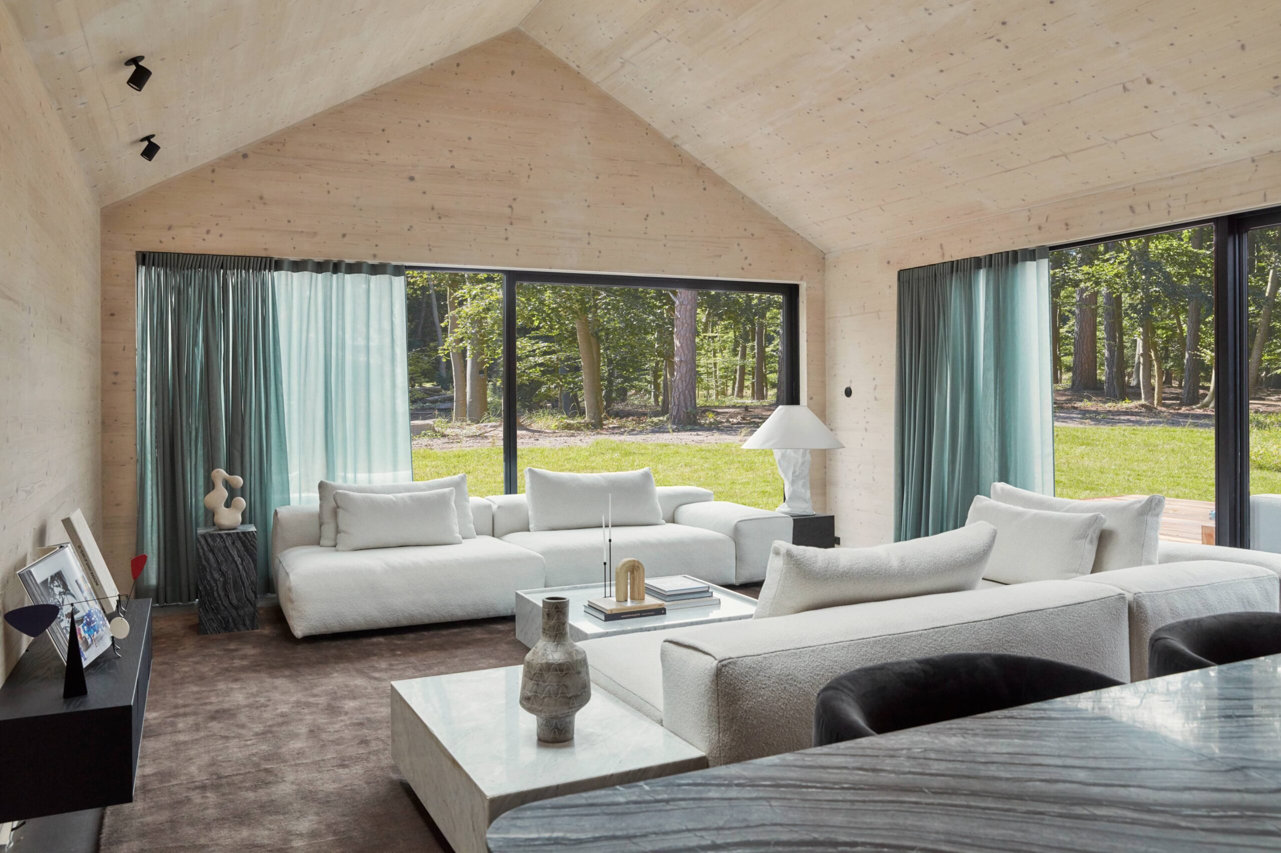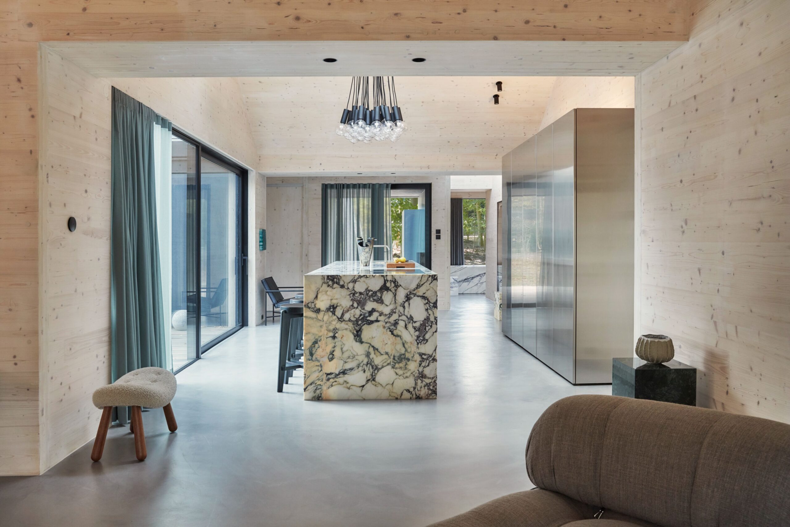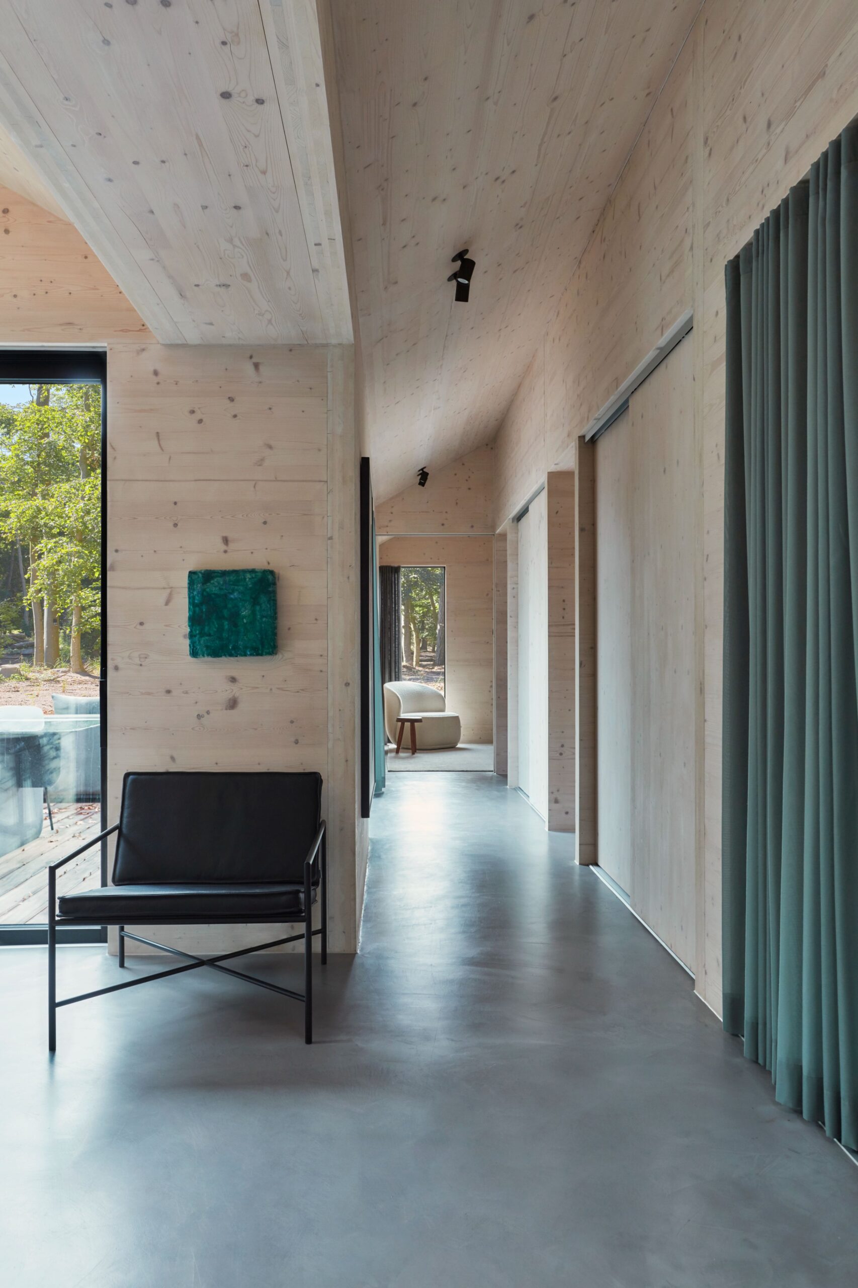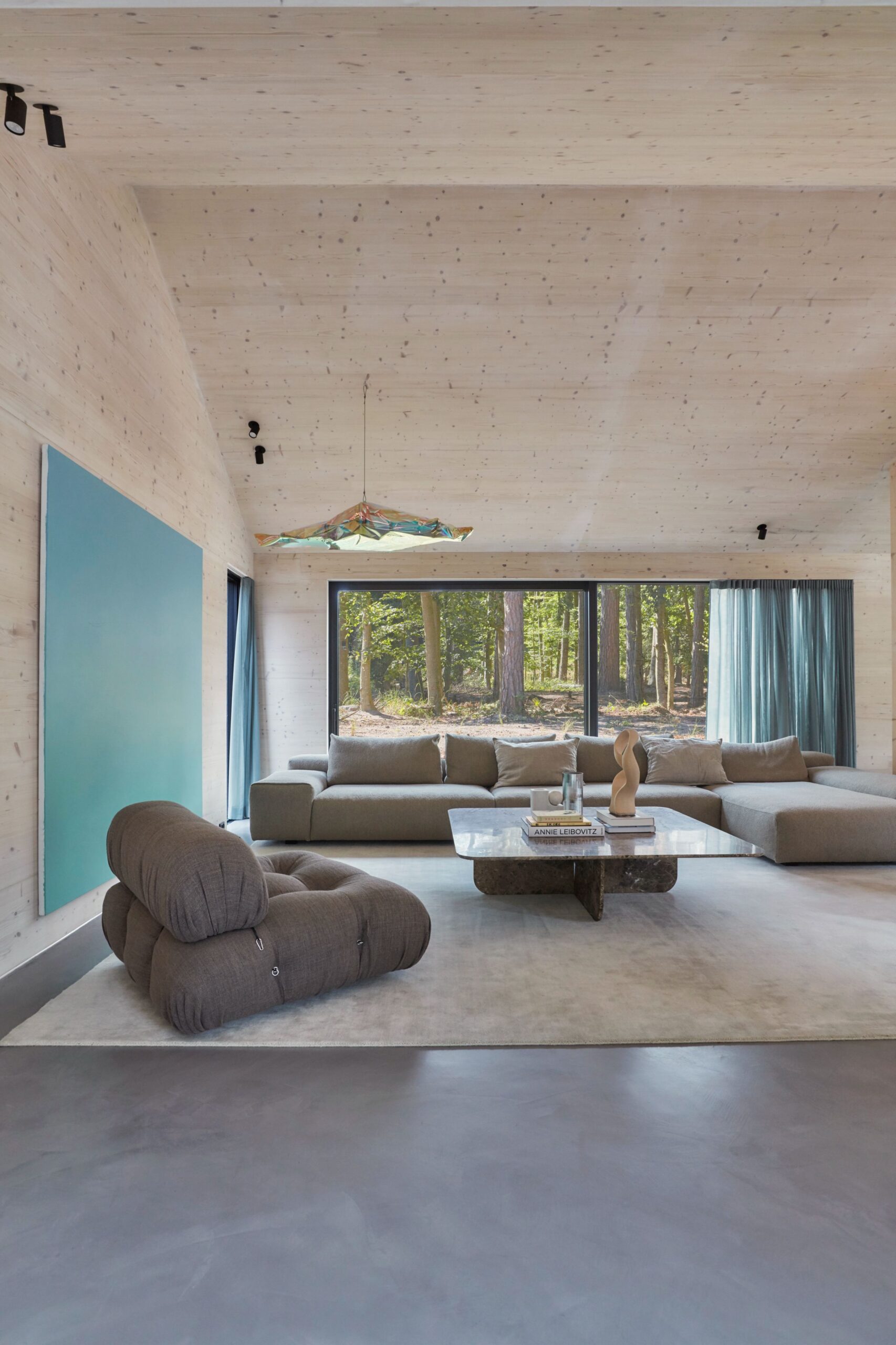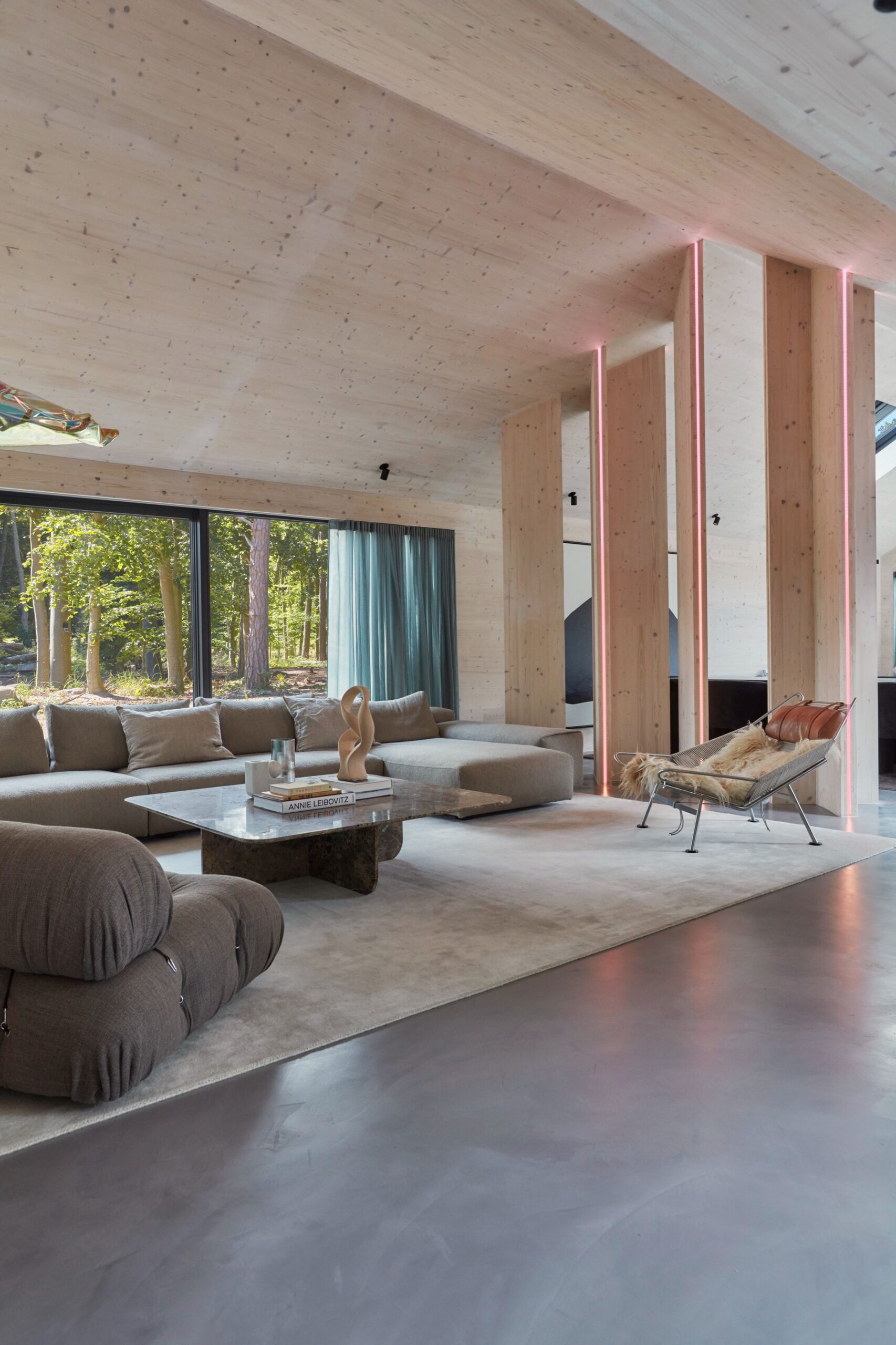 Villaen, der synes at svæve mellem skovens træer, er opført som en poetisk dialog mellem inde og ude. Den imposante wrap-around terrasse i eksotisk Cumaro-træ omkranser bygningen som et svævende plateau, der indbyder til kontemplative stunder i både sol og skygge.
