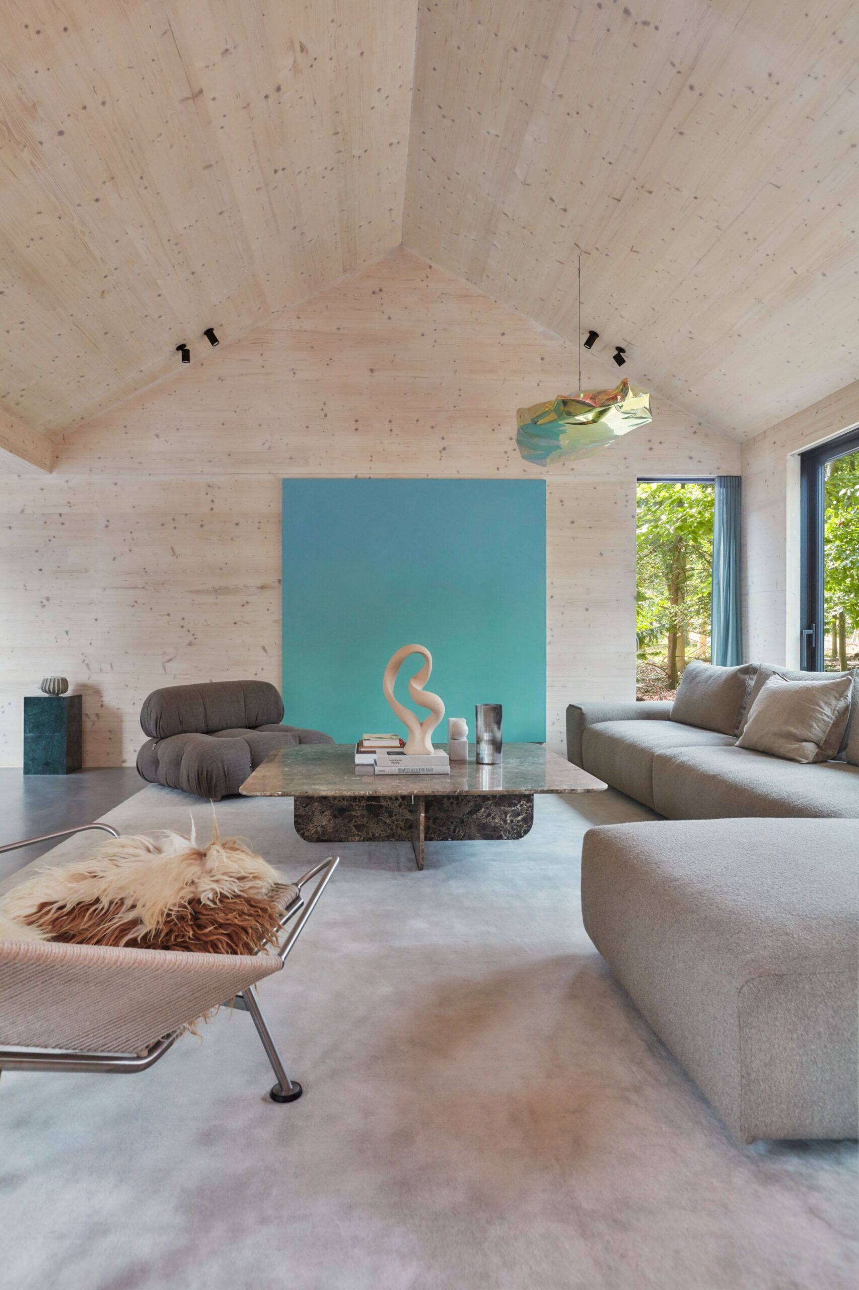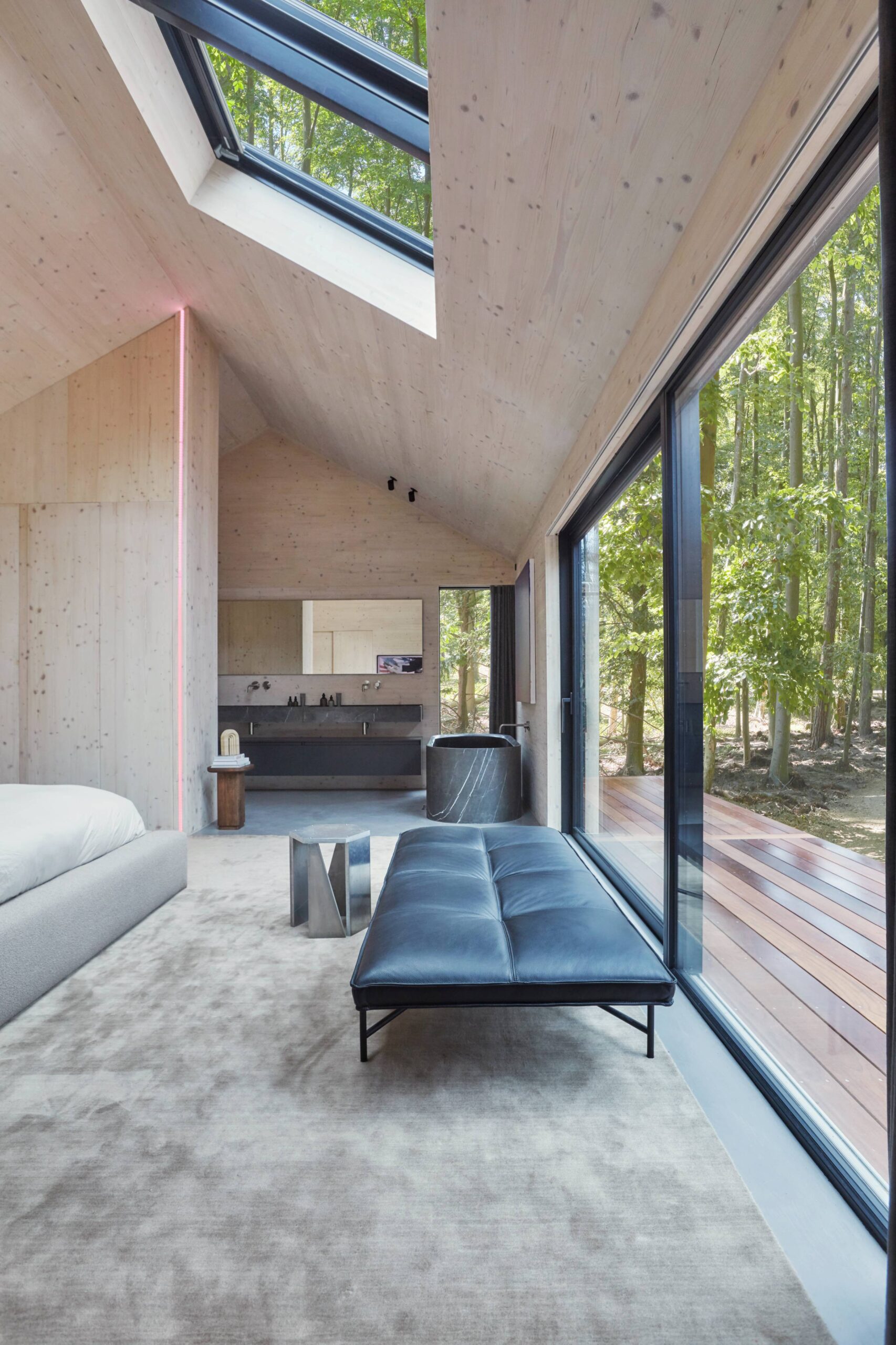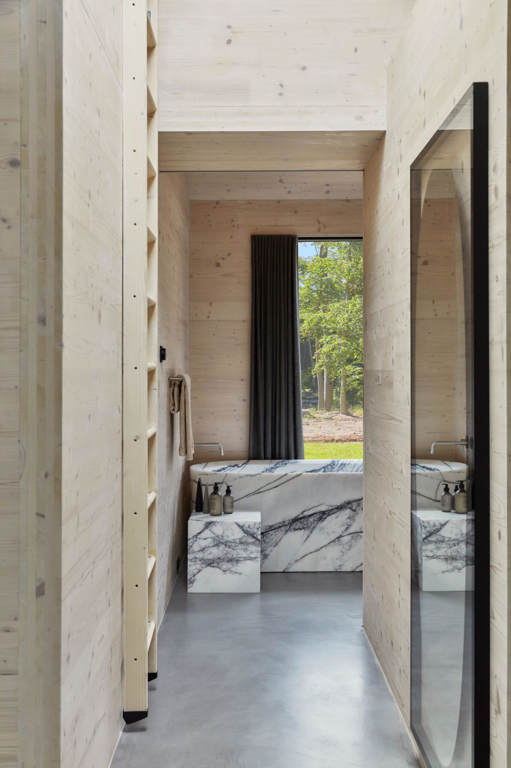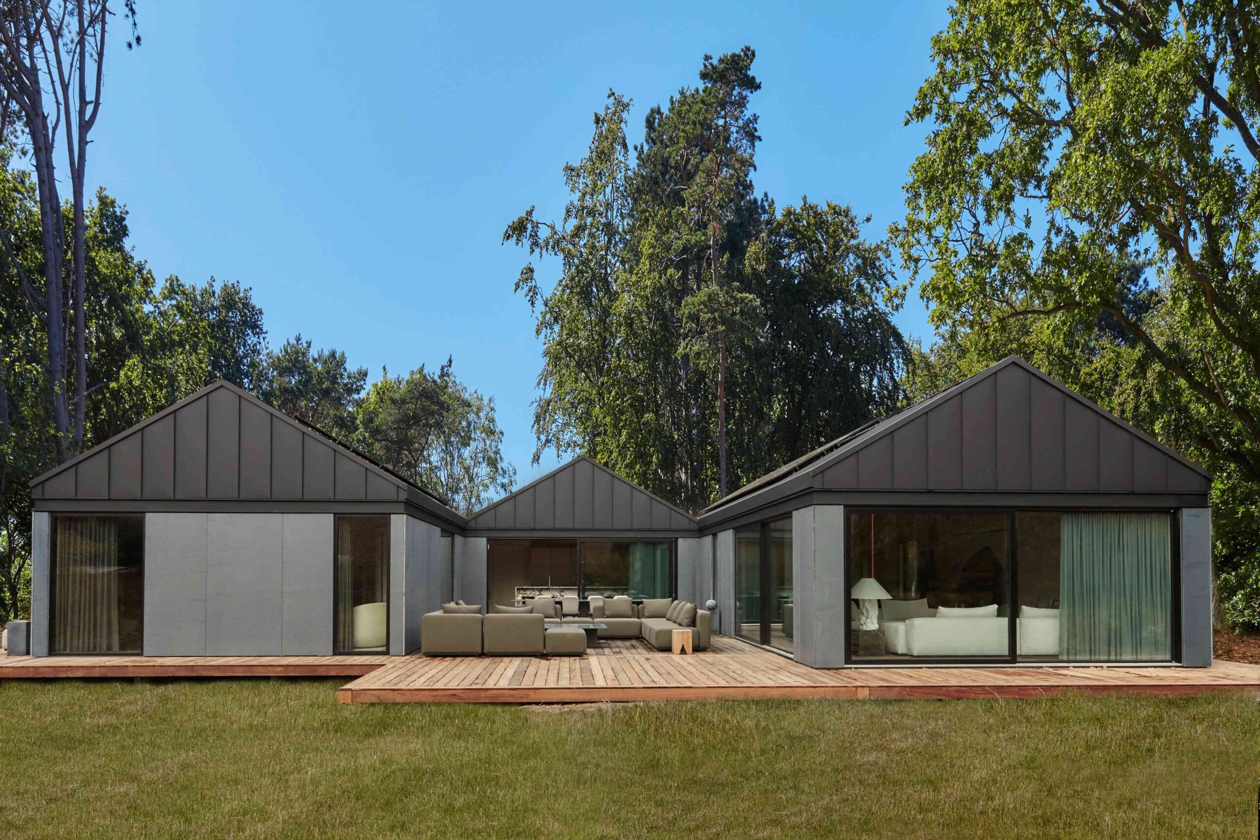 Villaen, der synes at svæve mellem skovens træer, er opført som en poetisk dialog mellem inde og ude. Den imposante wrap-around terrasse i eksotisk Cumaro-træ omkranser bygningen som et svævende plateau, der indbyder til kontemplative stunder i både sol og skygge.