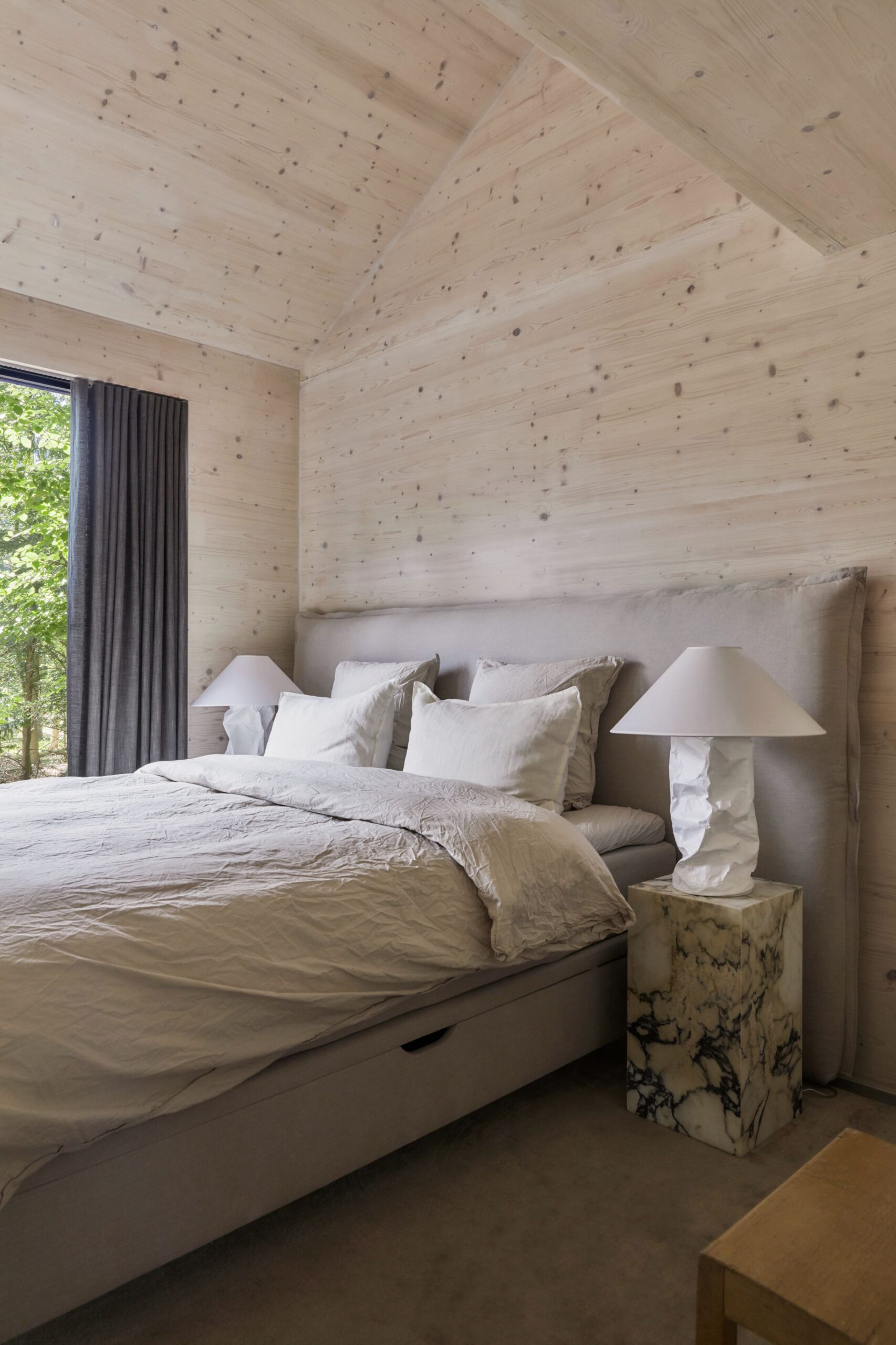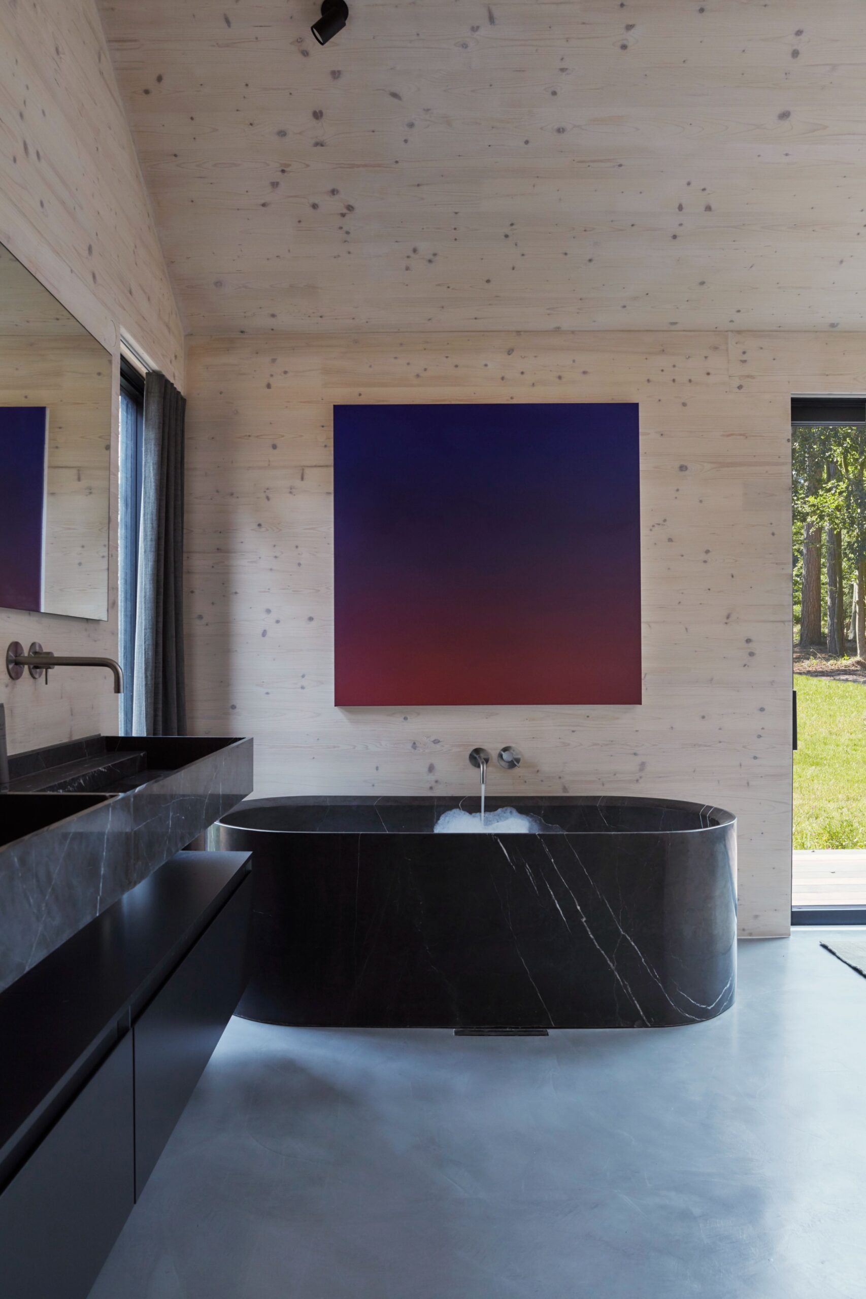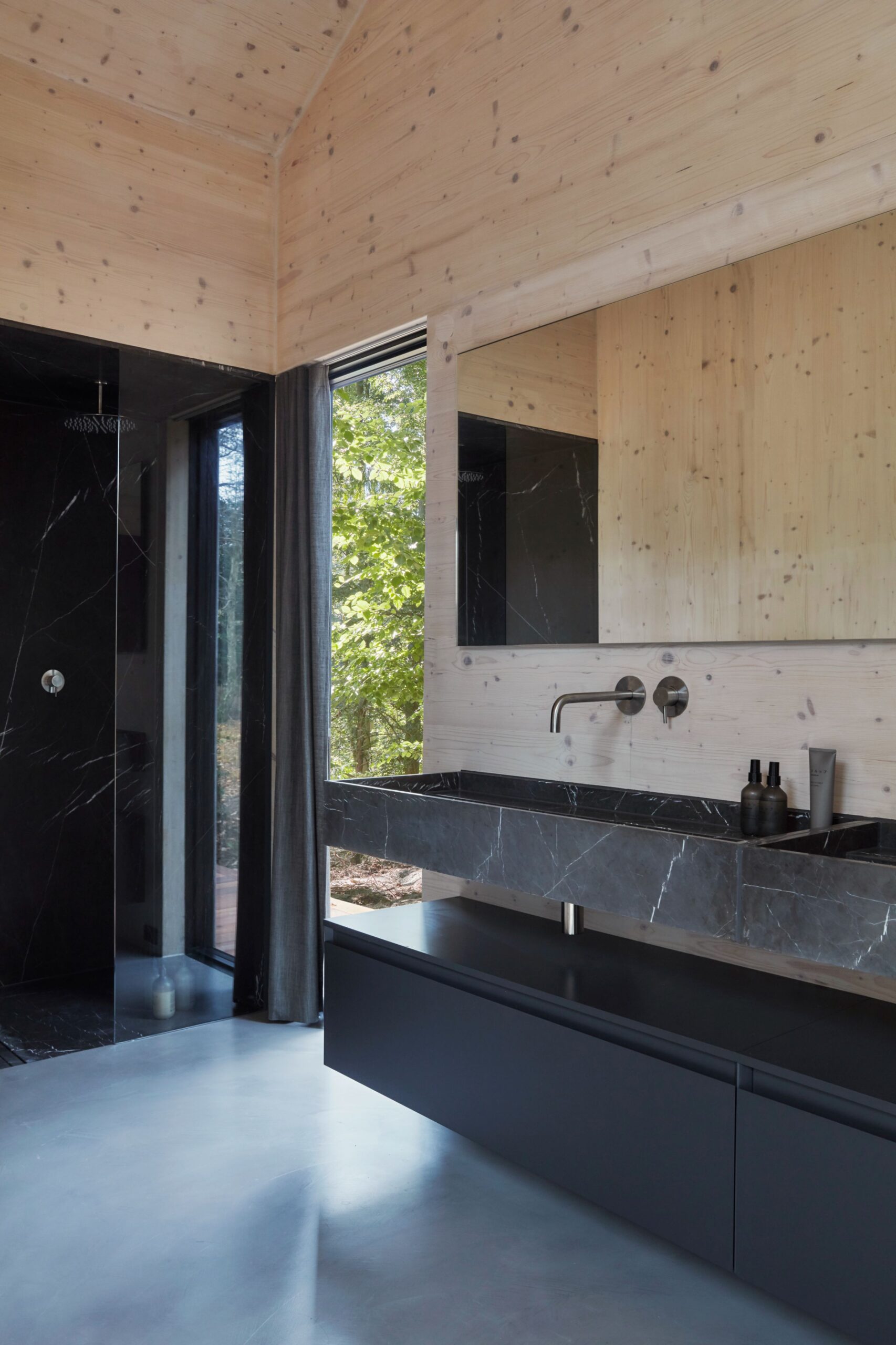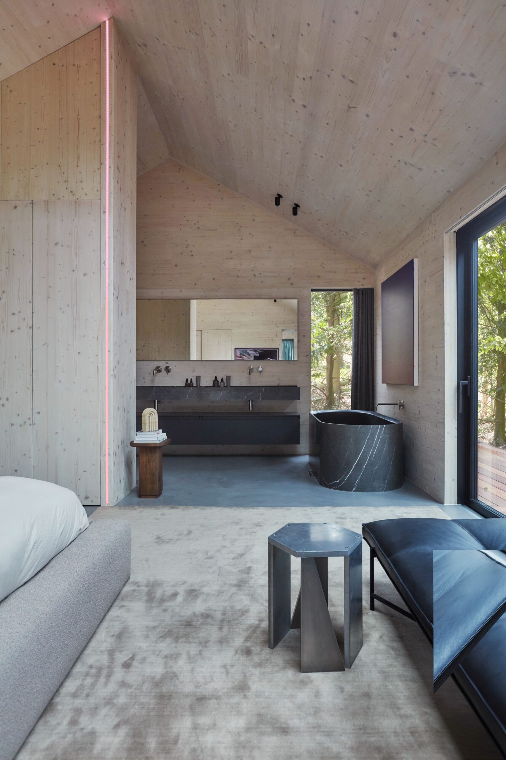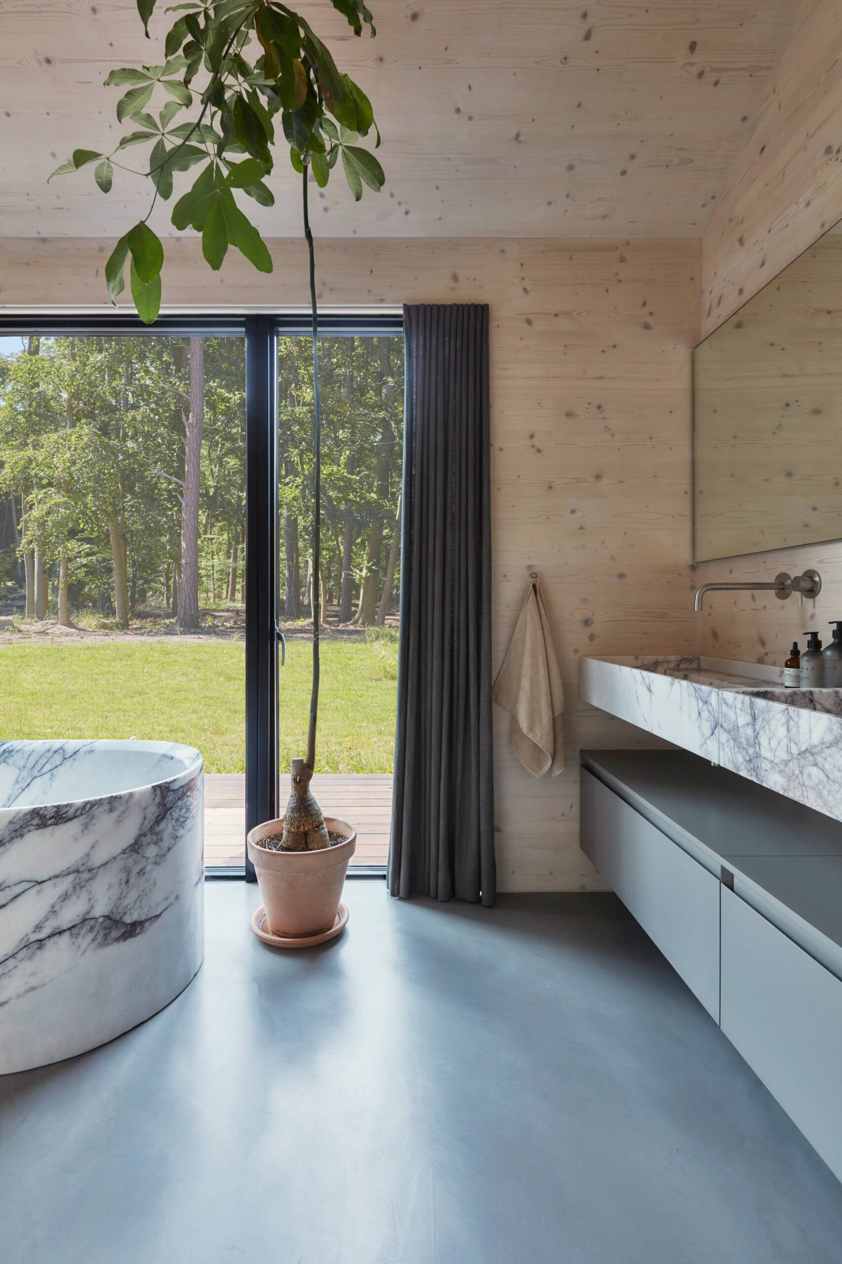 Villaen, der synes at svæve mellem skovens træer, er opført som en poetisk dialog mellem inde og ude. Den imposante wrap-around terrasse i eksotisk Cumaro-træ omkranser bygningen som et svævende plateau, der indbyder til kontemplative stunder i både sol og skygge.
