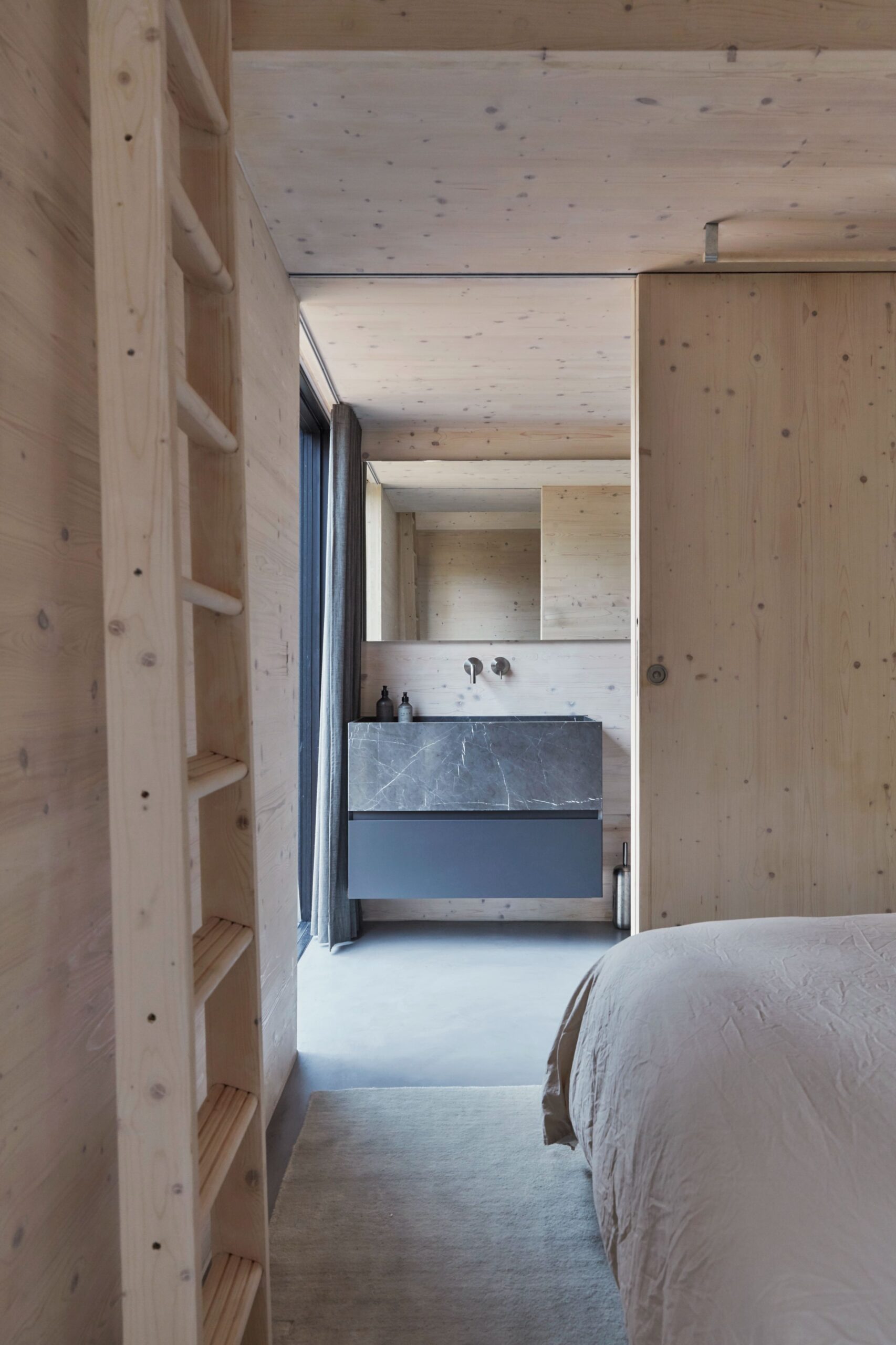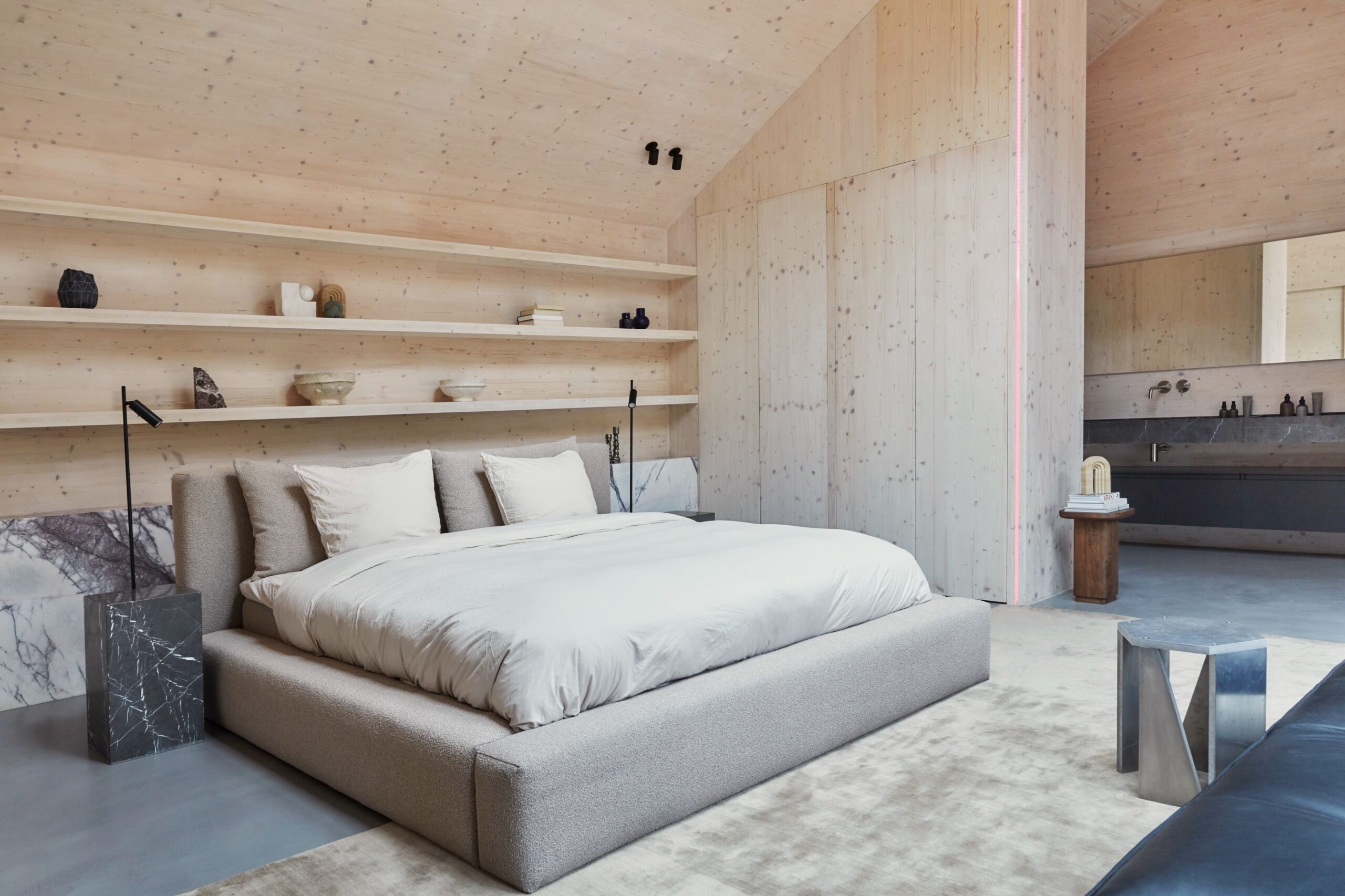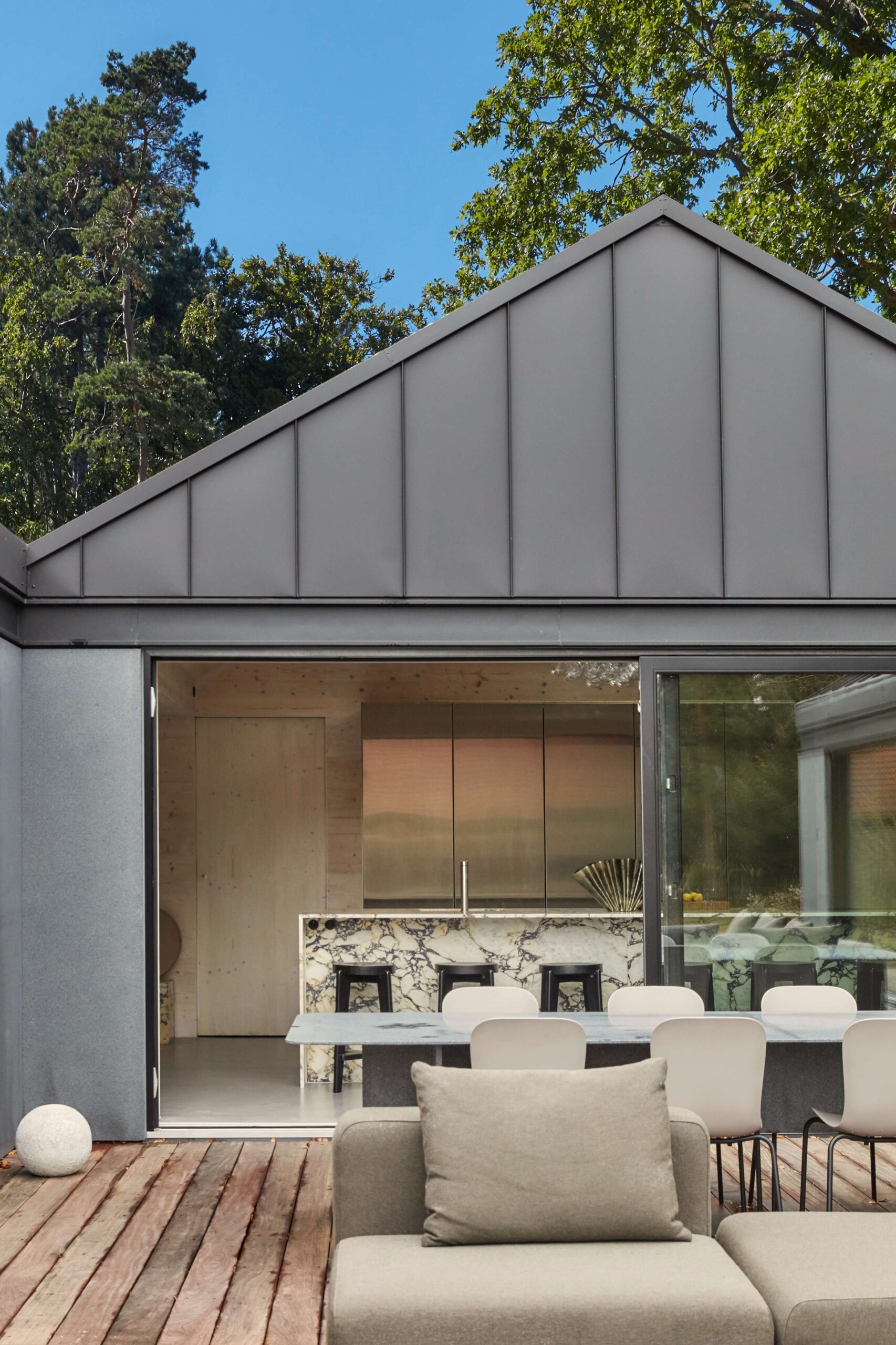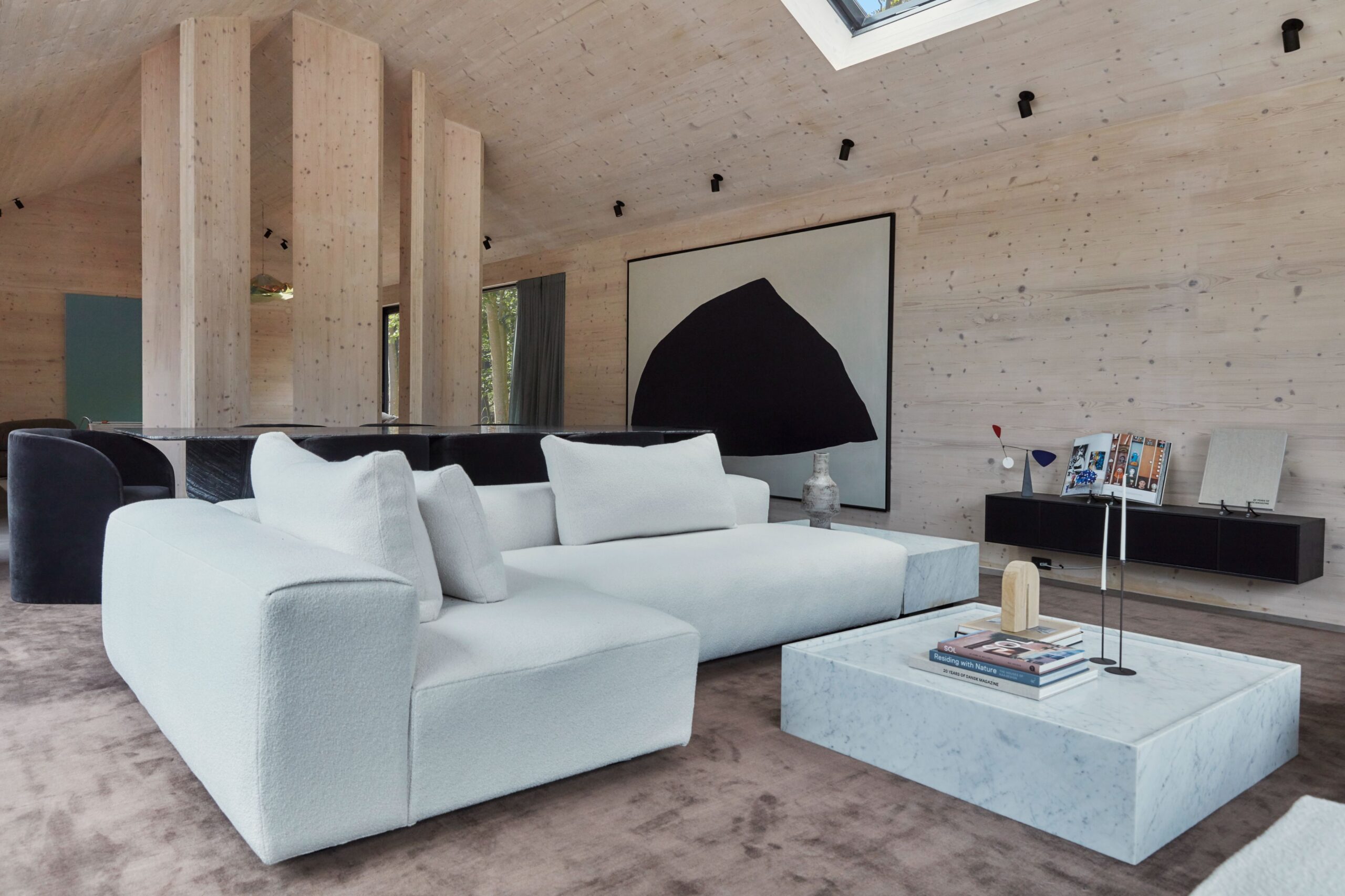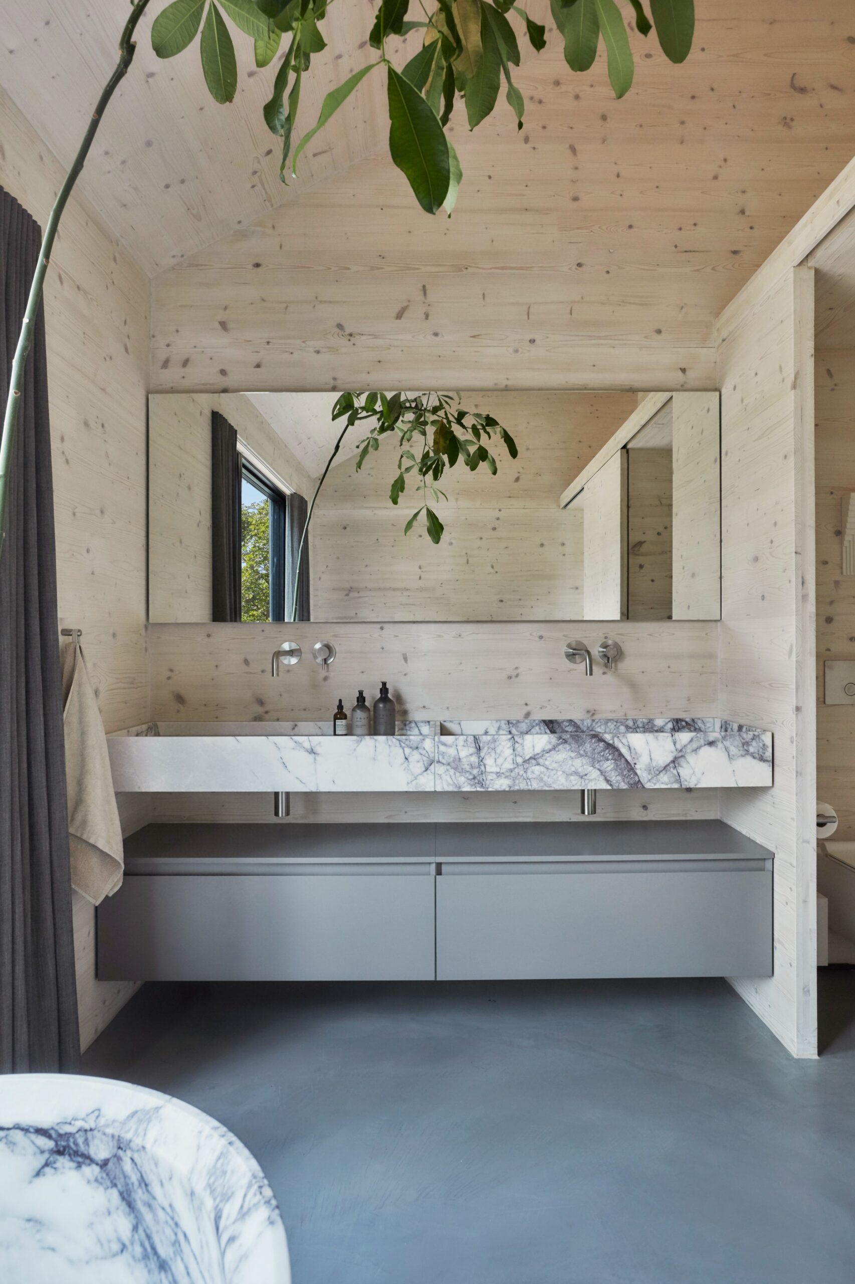 Villaen, der synes at svæve mellem skovens træer, er opført som en poetisk dialog mellem inde og ude. Den imposante wrap-around terrasse i eksotisk Cumaro-træ omkranser bygningen som et svævende plateau, der indbyder til kontemplative stunder i både sol og skygge.